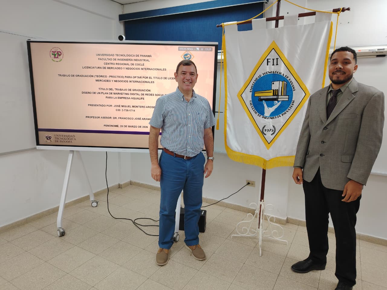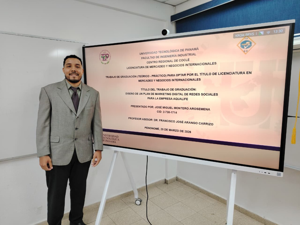 En un ambiente académico y alta expectativa, el joven José Miguel Montero Arosemena, estudiante de la Licenciatura en Mercadeo y Negocios Internacionales, de la Facultad de Ingeniería Industrial (FII) del Centro Regional de la Universidad Tecnológica de Panamá (UTP), en Coclé, presentó con éxito su trabajo de graduación titulado “Diseño de un Plan de Marketing Digital de Redes Sociales para la Empresa Aqualife” el miércoles 25 de marzo de 2026. La sustentación dejó una impresión positiva entre los miembros del jurado, quienes destacaron la claridad, profundidad y aplicabilidad del proyecto.